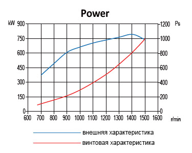 | Номинальная мощность, л.с. (кВт): | 720 (530) | 818 (601) | 900 (661) | 1000 (735) |