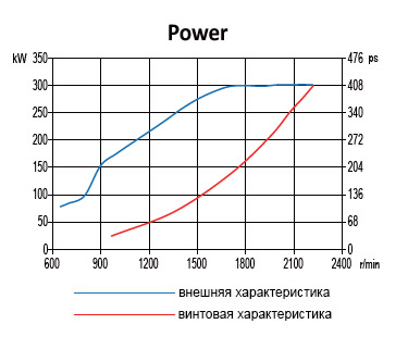 | Номинальная мощность, л.с. (кВт): | 300 (220) | 327 (240) | 350 (258) | 375 (275) | 400 (294) |